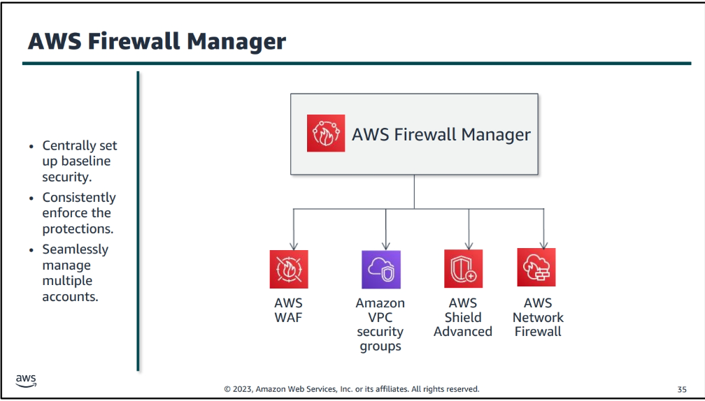 - AWS Firewall Manager is a security management service that allows you to centrally configure and manage firewall rules across your accounts and applications in AWS Organization. Firewall Manager is useful for centrally managing firewall rules across multiple accounts and applications.