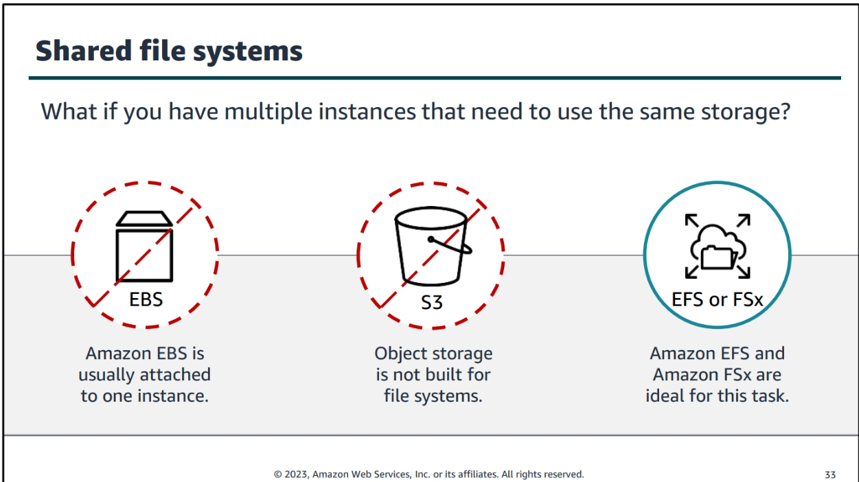 Instance Store: Temporary block-level storage that is directly attached to the EC2 instance. It is ideal for temporary storage needs but does not persist data if the instance is stopped or terminated.