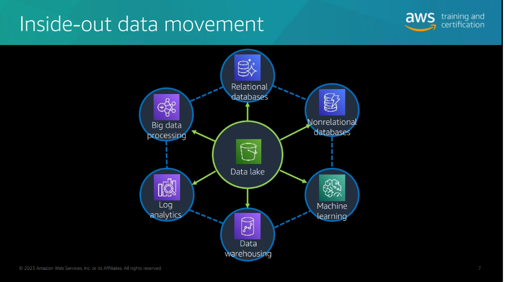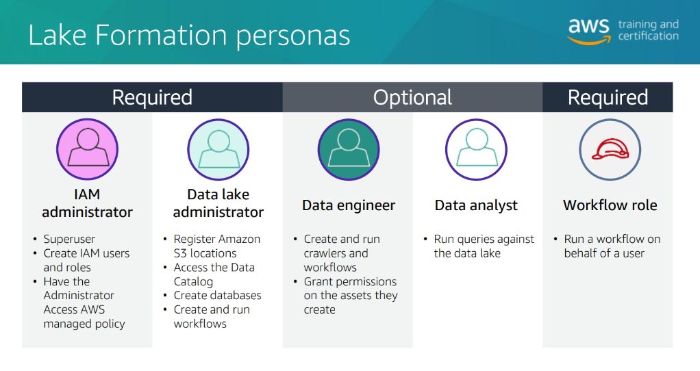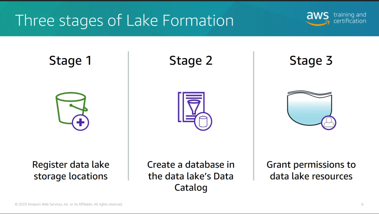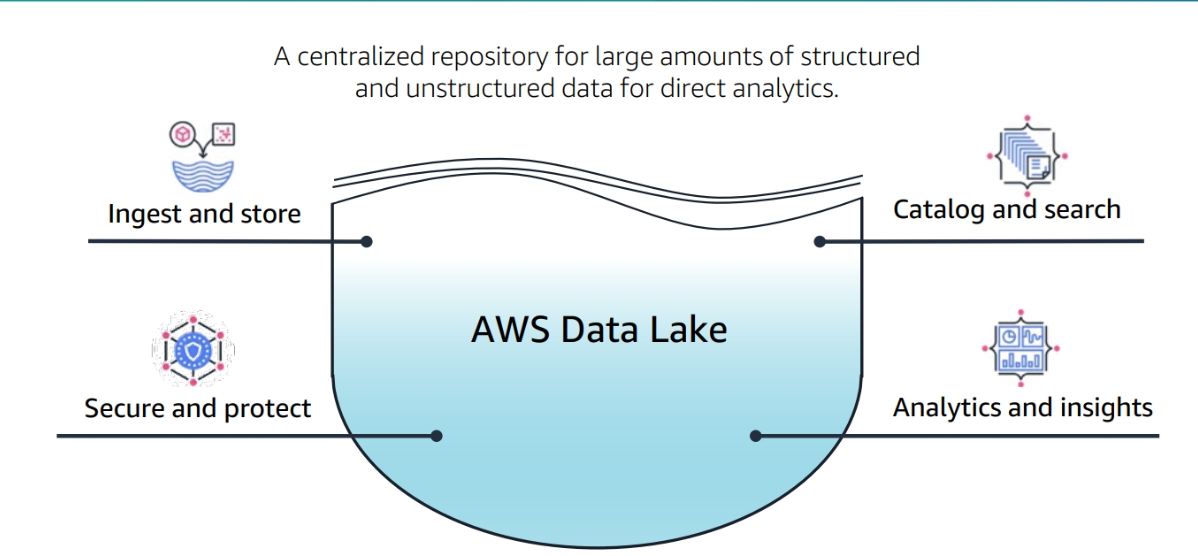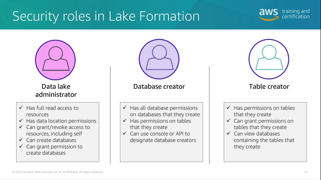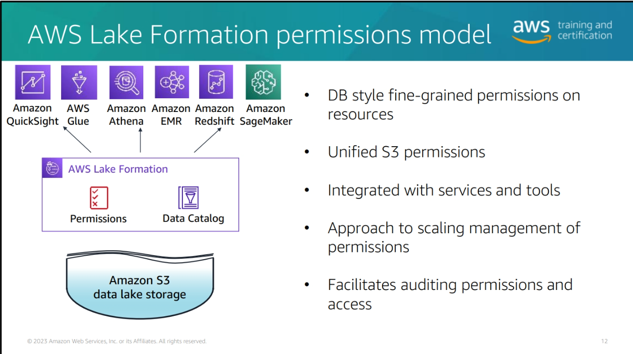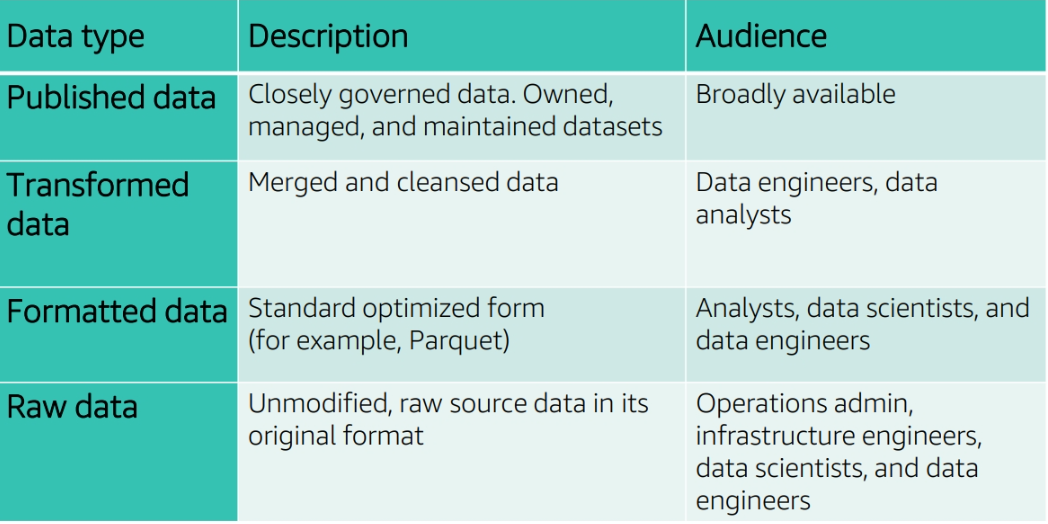 Scalable data lakes – This course has focused on the business value of data lakes and how to build data lakes with AWS Lake Formation. Business insight is driven by data of all types: structured, semi-structured, and unstructured. Organizations have large volumes of data generated continuously. To be able to extract value, data must be trusted and convenient to find by those roles that need access. Key AWS services include the following: • Amazon Simple Storage Service (Amazon S3) – Highly durable, scalable, secure, fast, and inexpensive storage service.