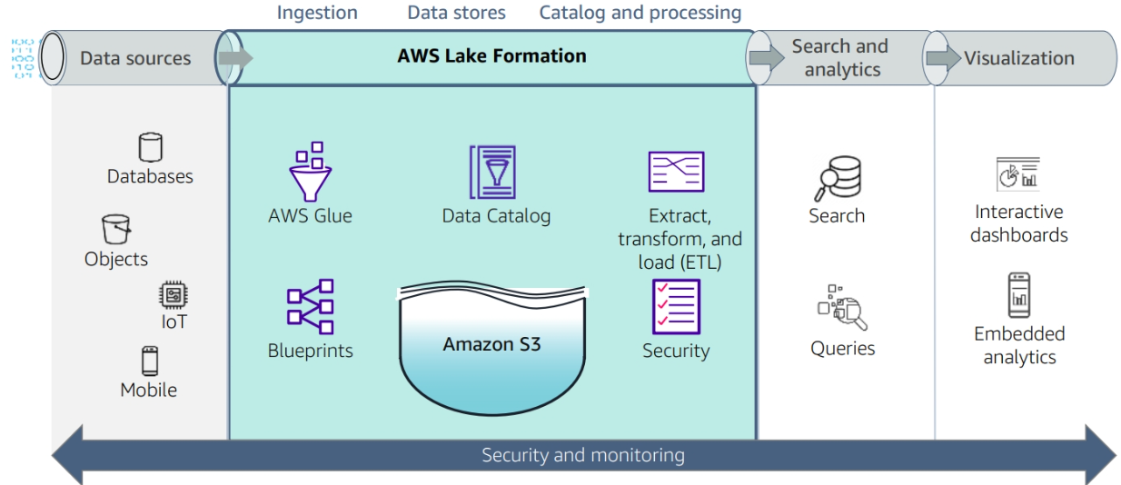 • Lake Formation – Integrated data lake service that makes it convenient to ingest, clean, catalog, transform, and secure data and make it available for analysis and machine learning (ML).