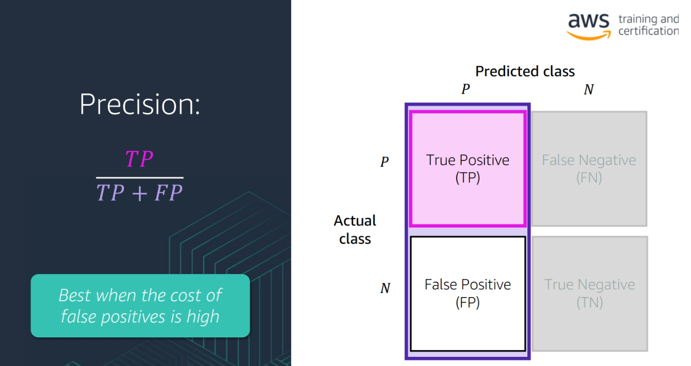 - Precision: The number of true positive cases divided by the number of true positive and false positive cases