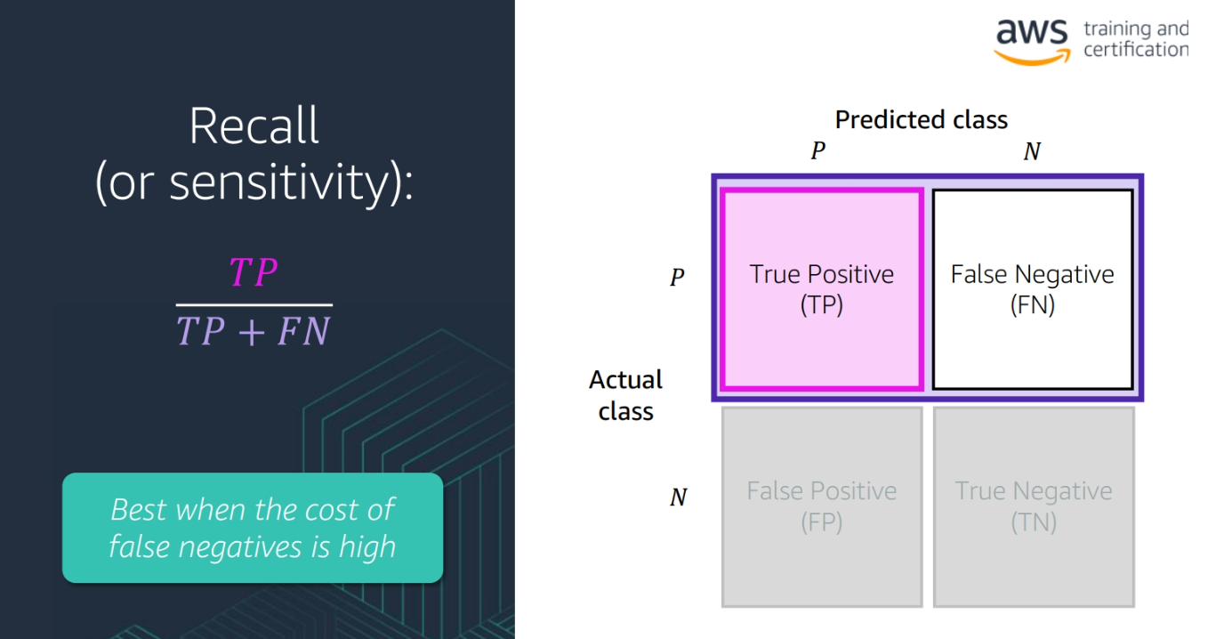 Recall: The number of true positive cases divided by the number of true positive and false negative cases